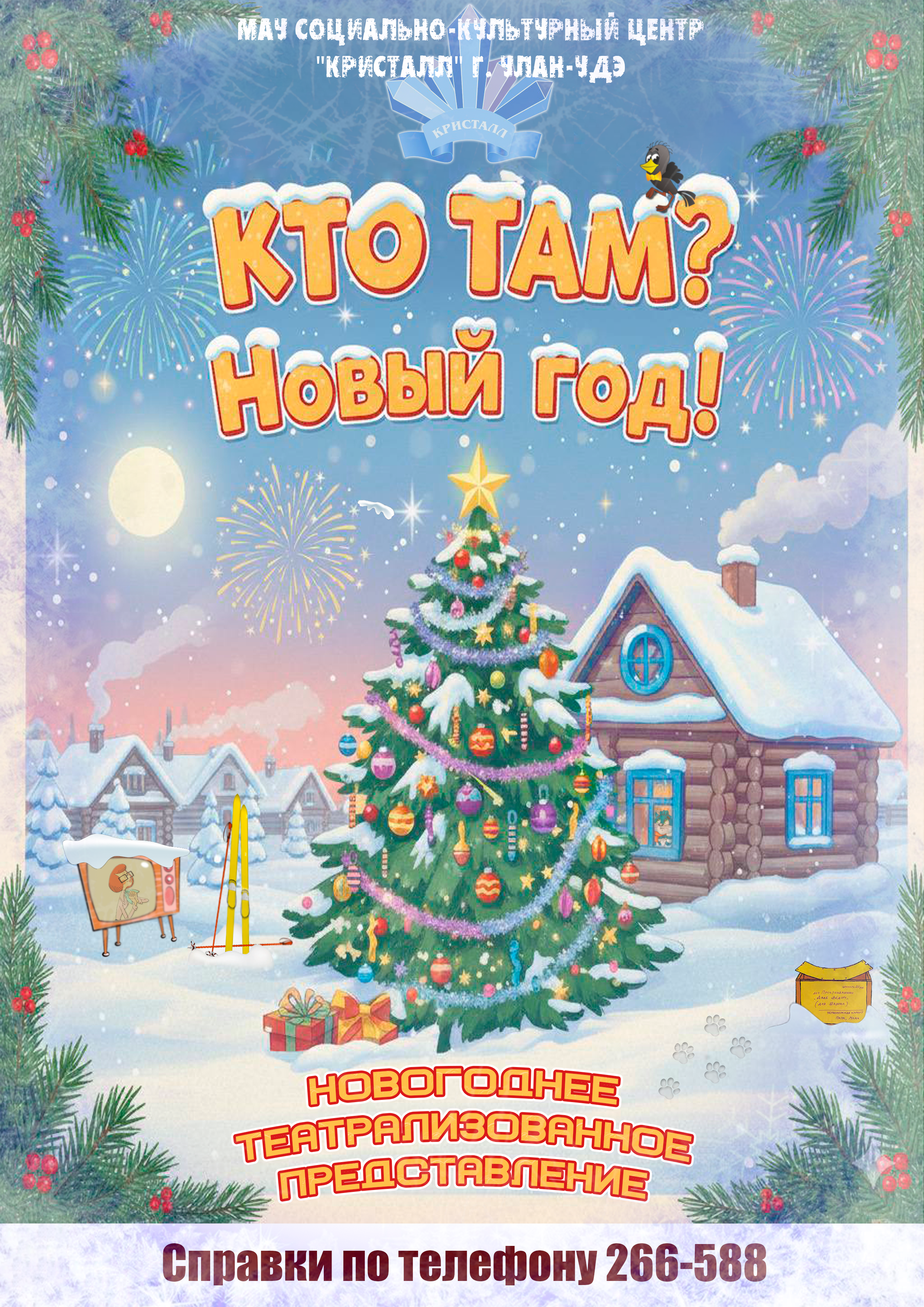Новогоднее театрализованное представление «Кто там? Новый год!» Уважаемые зрители! Приглашаем вас и ваших детей стать участниками незабываемого новогоднего приключения, созданного по мотивам всеми любимого мультфильма «Простоквашино»! В уютной деревне вовсю идёт подготовка к празднику. Дядя Фёдор, кот Матроскин, пёс Шарик и галчонок Хватайка готовят угощение, наряжают ёлку и с нетерпением ждут подарков. Но вот на пороге появляется запыхавшийся почтальон Печкин с тревожной вестью: волшебный мешок с новогодними подарками бесследно исчез по дороге в Простоквашино! Без подарков Новый год не наступит! Нашим друзьям предстоит отважная экспедиция по заснеженным тропинкам. На пути им будут встречаться старые и новые друзья, готовые помочь в поисках. А главными помощниками станете Вы, дорогие зрители! Только с вашей поддержкой герои смогут преодолеть все препятствия:· Вместе с Шариком вы будете искать следы похитителя.